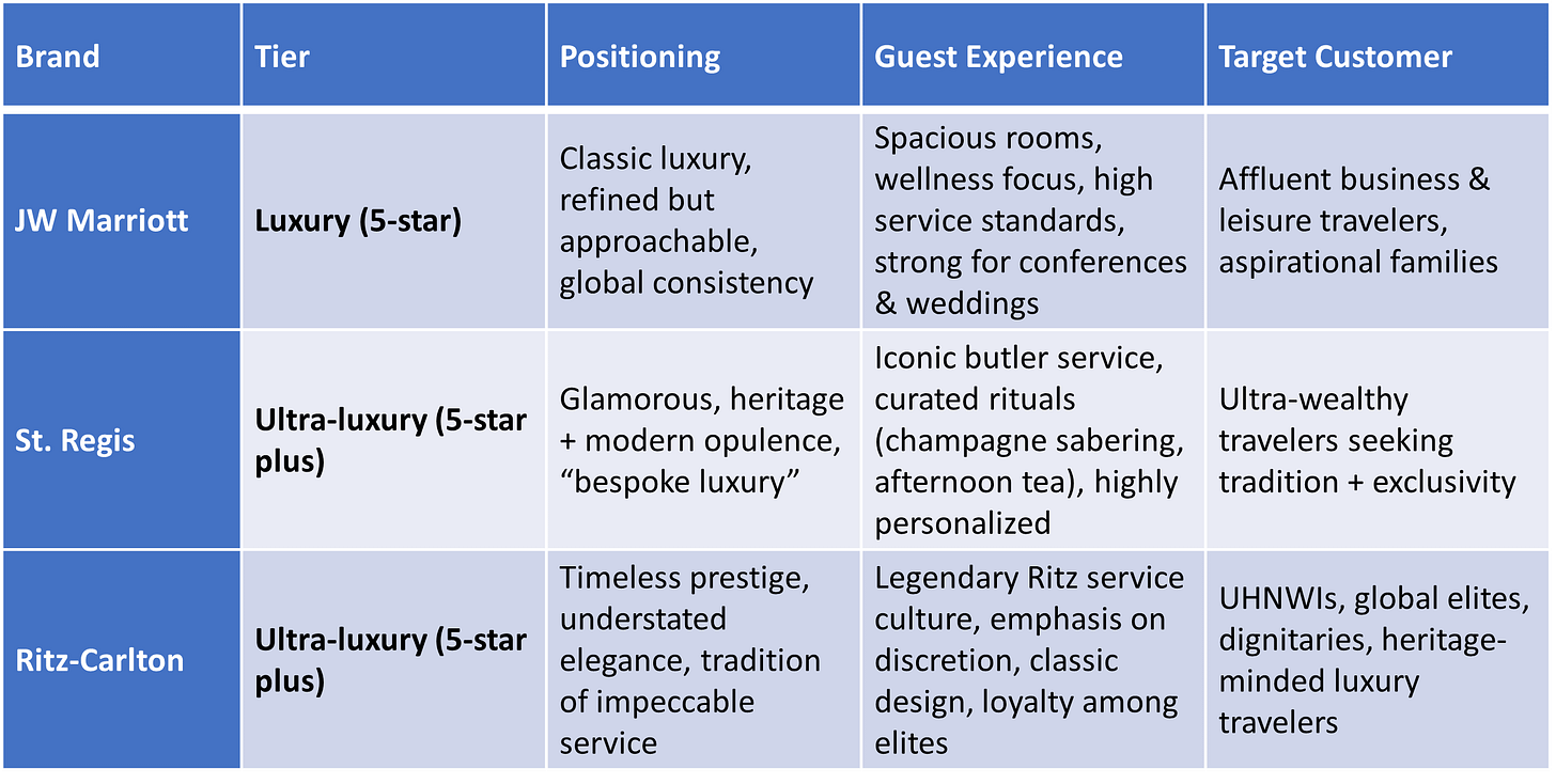 Marriott carefully differentiates JW Marriott, St. Regis, and Ritz-Carlton to reduce cannibalization as we see in the table above. But there is overlap